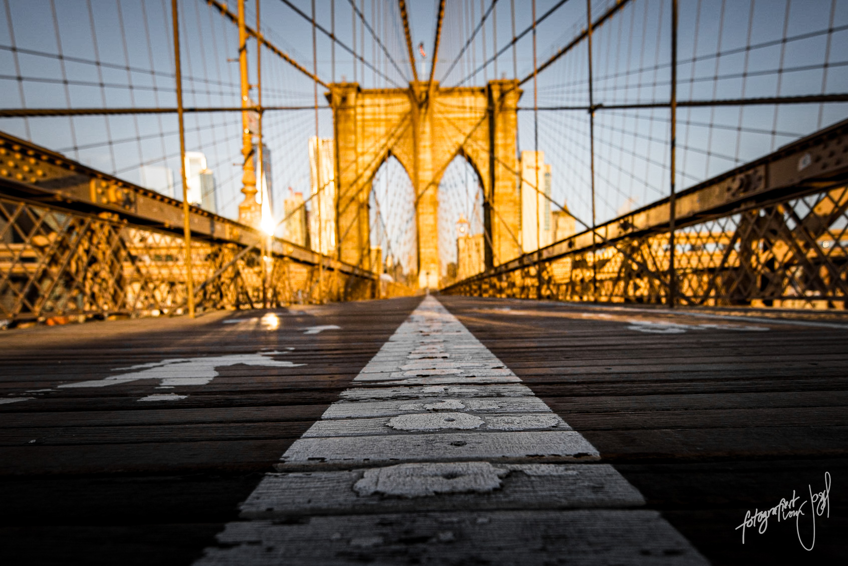 Wenn du den Weg über die Manhattan Bridge wählst, garantiere ich dir, dass du am liebsten alle fünf Meter ein Foto machen möchtest. Mach das nicht. Achte viel mehr auf den Zaun: dort wo große Löcher im Zaun sind oder wo der Zaun offensichtlich geflickt wurde, da hast du garantiert ein spektakuläre Motiv. So kannst Du etwas den Fotoausschuss reduzieren.